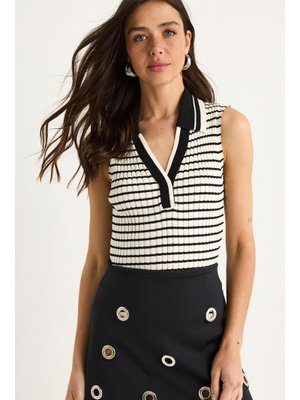 Bianco Lucci Ekru Siyah Polo Yaka Çizgili Fitilli Kalın Askılı Yazlık Triko Bluz