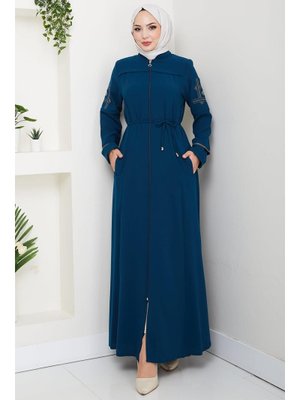 Hafsa Mina Petrol Bağcıklı Kolu Nakışlı Ferace