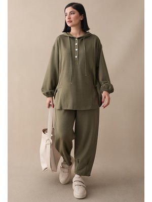 InStyle Kapüşonlu Düğmeli İkili Haki Modal Takım