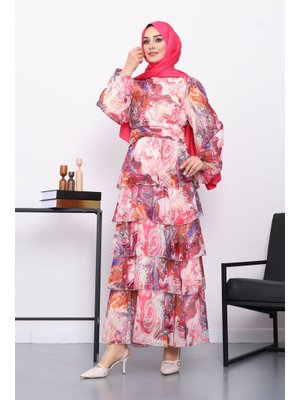 İmaj Butik Fuşya Desenli Katlı Şifon Elbise