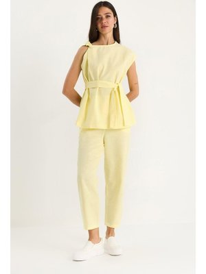 Bianco Lucci Limon Sarısı Omuz Düğüm Detaylı Kuşaklı Keten Alt Üst Takım