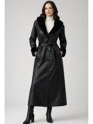 Benguen Siyah Yakası Ve Kolları Kürk Detaylı Kaban