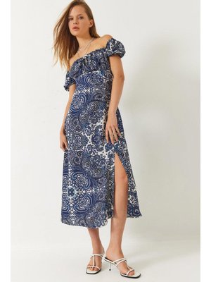 Bianco Lucci Mavi Bağlama Yakalı Yırtmaç Detaylı Desenli Midi Elbise