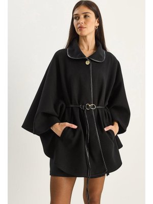 Bianco Lucci Siyah Cep Detaylı Suni Deri Kemerli Kaşe Panço