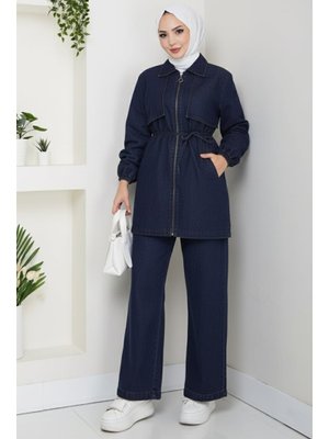 Bestenur Koyu Mavi İpli Ceket Pantolon Kot İkili Takım