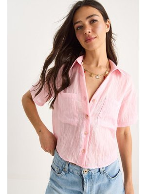Bianco Lucci Şeker Pembe Kendinden Çizgili Çift Cep Detaylı Viskon Crop Gömlek