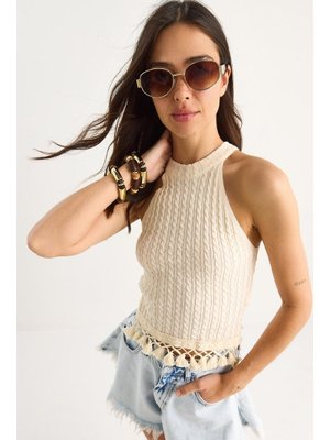Bianco Lucci Ekru Desenli Ucu Püsküllü Triko Bluz