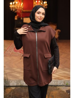 İmaj Butik Kahverengi Yakası Ve Beli Stoper Lastikli Cepli Scuba Yelek