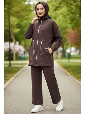 Tofisa Kahve Belde Lastik Detaylı Fermuarlı Cepli Modal İkili Takım