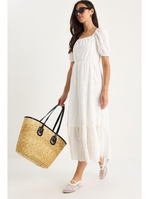 Bianco Lucci Beyaz Kare Yaka Beli Lastikli Karpuz Kollu Astarlı Örme Brode Elbise