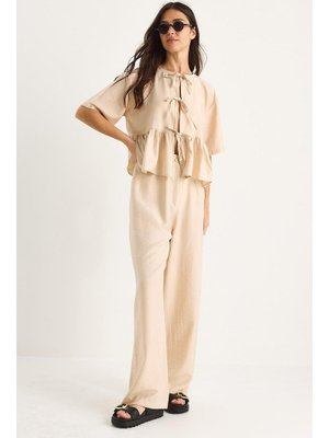 Bianco Lucci Bej Bağlama Detaylı Kısa Kollu Bluz Pantolon Alt Üst Takım