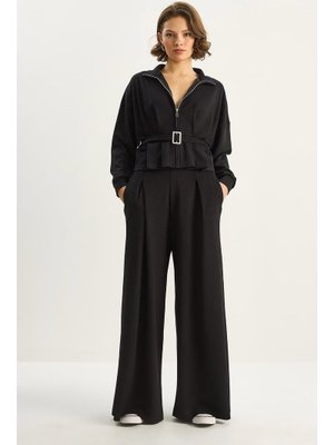 Bianco Lucci Siyah Beli Kemerli Pileli Hırka Yüksek Bel Bol Pantolon Alt Üst Modal Takım