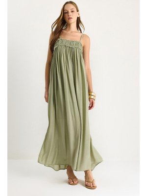 Bianco Lucci Çağla Yeşili Askılı Büzgülü Cep Detaylı Astarlı İnce Pamuklu Elbise