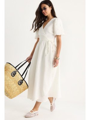Bianco Lucci Ekru Kruvaze Kapamalı Balon Kollu Uzun Müslin Elbise