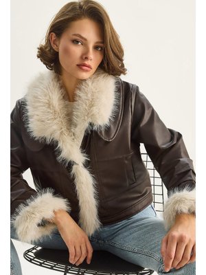 Bianco Lucci Kahve Yakası Ve Kolları Kürklü Suni Deri Ceket