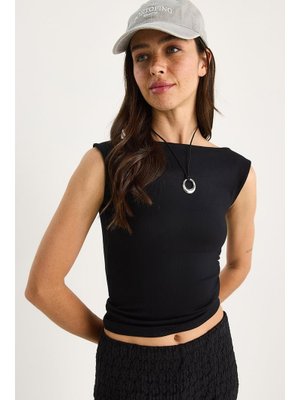 Bianco Lucci Siyah Kayık Yaka Tek Tarafı Büzgülü Basic Bluz