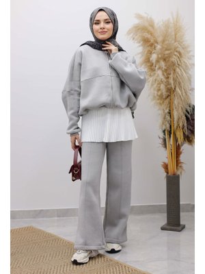 Tesettür Dünyası Gri Fermuarlı Şardonlu Eşofman Takım