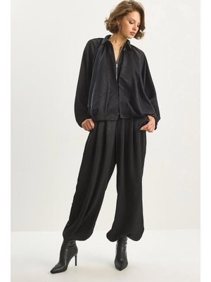 Bianco Lucci Siyah Polo Yaka Fermuarlı Balon Kol & Etek Ucu Detaylı Saten Alt Üst Takım