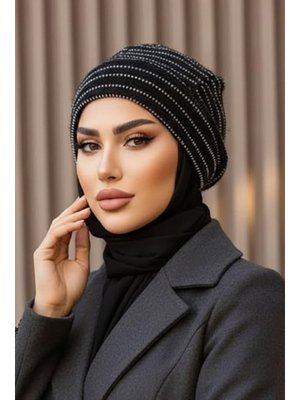 AİŞE TESETTÜR Siyah Triko Çizgili Atkısız Bere
