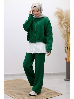 Tesettür Dünyası Zümrüt Yeşili Fermuarlı Şardonlu Eşofman Takım
