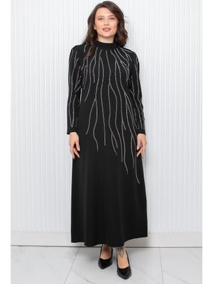 FAHİMA Siyah Taş Baskı Detaylı Abiye Elbise