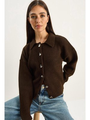 Bianco Lucci Acı Kahve Gömlek Yaka Düğme Detaylı Örgü Triko Hırka