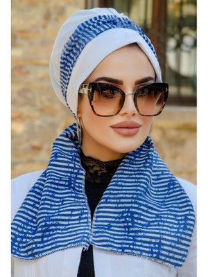AİŞE TESETTÜR Beyaz Mavi Çizgi Desen Fularlı Bone
