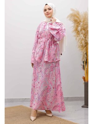 Tesettür Dünyası Pembe Desenli İp Bağlamalı Etekli Takım