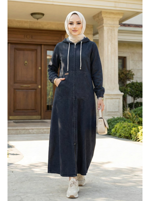 Harmatime butik Kapüşonlu, Cepli Ve Fermuarlı Denim Siyah Kot Kap
