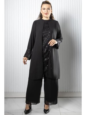 FAHİMA Siyah Taş Payet İşlemeli Şifon Pantolon Tunik Takım