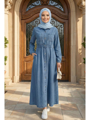 Harmatime butik Belden Lastikli Cep Detaylı Koyu Denim Kot Mavi Elbise