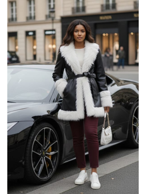 Harmatime butik Tüylü İçi Astarlı Kemerli Deri Siyah Ceket