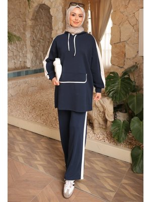 İmaj Butik Lacivert Kapüşonlu Renk Bloklu Tunik Pantolonlu Takım