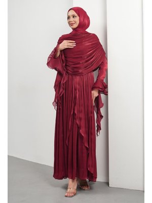 İmaj Butik Bordo Seyyar Pelerinli Fırfırlı Abiye Elbise