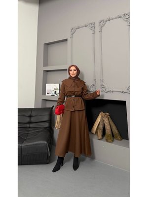 Volt Clothing Kahverengi Gömlek Yaka Önü Düğme Detaylı Etekli Takım