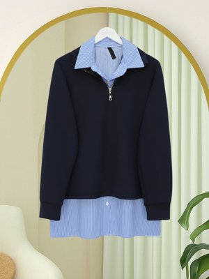 Podyumplus Laci Sıfır Kol Çizgili Gömlekli Yarım Fermuarlı Sweat İkili Üst Takım