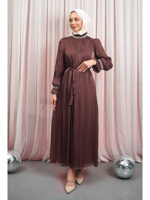 İmaj Butik Mürdüm Kol Yaka Taşlı Abiye Elbise