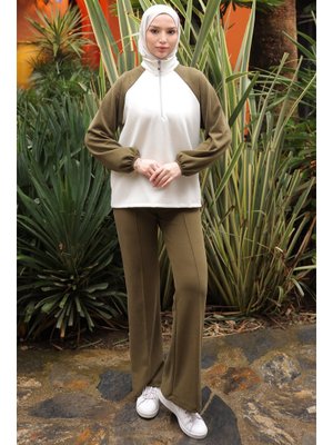 İmaj Butik Açık Haki Fermuarlı Garnili Sweat Pantolonlu Takım