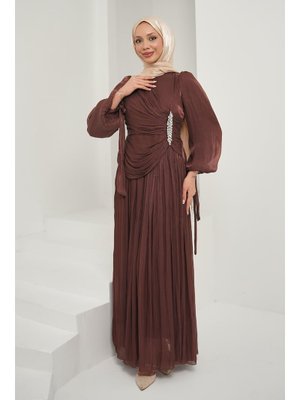 İmaj Butik Bordo Önü Taş Detaylı Kol Bağlamalı Abiye Elbise