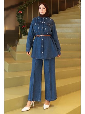 MODAMİHRAM Koyu Mavi Cepli Taş Detaylı Kot Takım