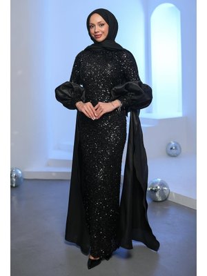 İmaj Butik Siyah Payetli Balon Kol Detaylı Abiye Elbise