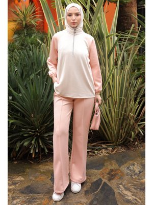 İmaj Butik Somon Fermuarlı Garnili Sweat Pantolonlu Takım