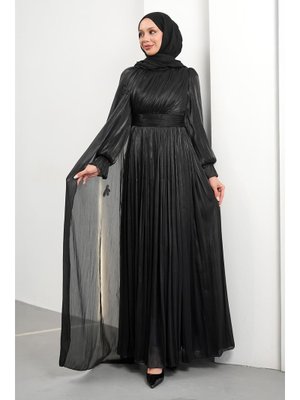 İmaj Butik Siyah Pelerin Detaylı Piliseli Abiye Elbise