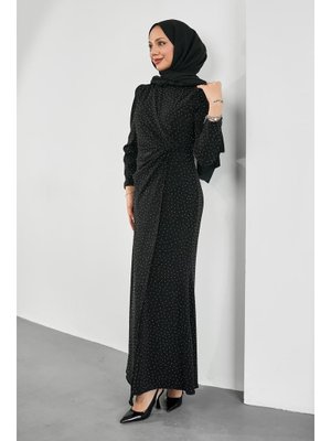 İmaj Butik Siyah Simli Taşlı Önü Drapeli Abiye Elbise