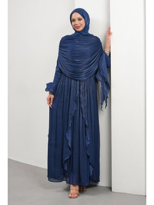İmaj Butik Lacivert Seyyar Pelerinli Fırfırlı Abiye Elbise