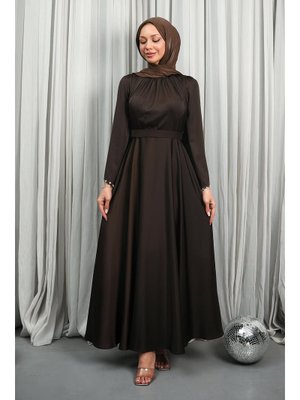 İmaj Butik Kahverengi Kolları Taşlı Kuşaklı Saten Abiye Elbise