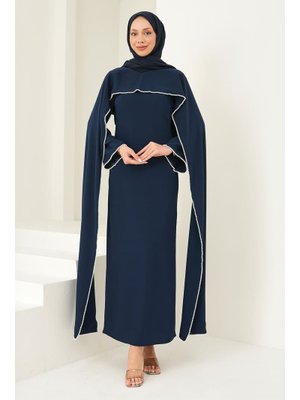 İmaj Butik Lacivert İnci Detaylı Pelerinli Abiye Elbise