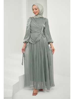 İmaj Butik Mint Yeşili Önü Taş Detaylı Kol Bağlamalı Abiye Elbise