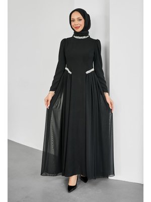 İmaj Butik Siyah Yaka Ve Bel Taşlı Kuyruklu Abiye Elbise