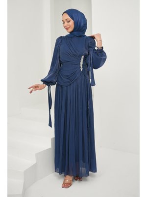 İmaj Butik Lacivert Önü Taş Detaylı Kol Bağlamalı Abiye Elbise